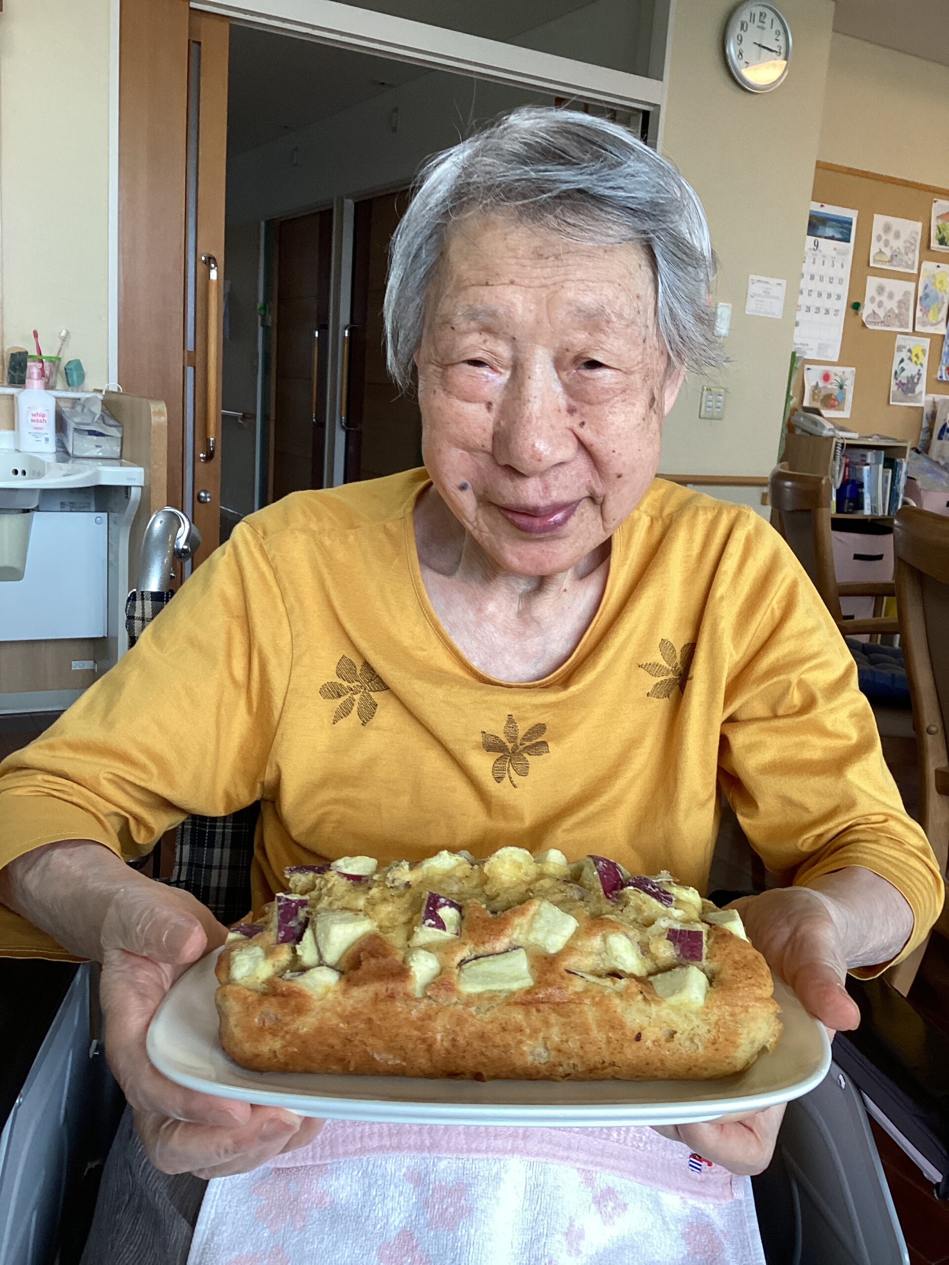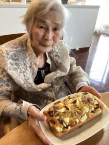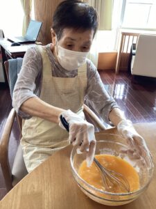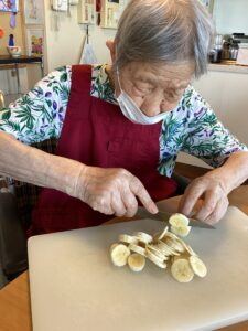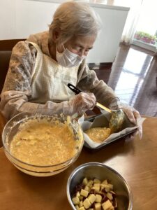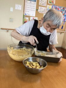 材料を切る、混ぜる、焼くの工程を分担して、皆さんでバナナとさつまいものパウンドケーキを作りました。