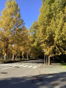 メタセコイヤの黄色と楓の赤がとても綺麗でした。