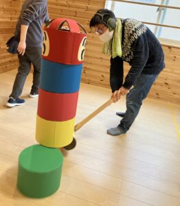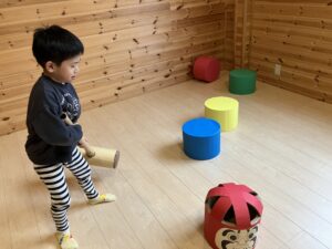 だるまの顔が落ちないように力を調整したり、打ち方を変えてみます