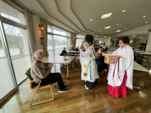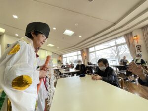 眉丈園の神と巫女が登場し、皆さんの無病息災をお祈りしました