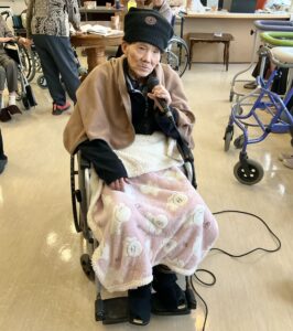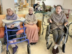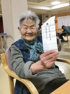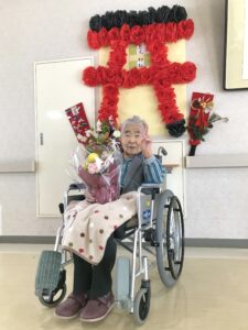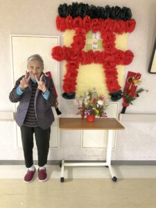 職員と入居者の皆さんとで協力し、花紙を広げ神社の鳥居を作りました👏🏻
