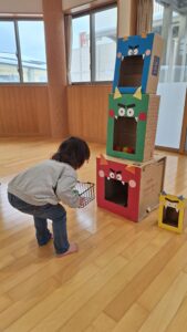 豆に見立てたカラーボールでオニの玉入れゲームをしました✨