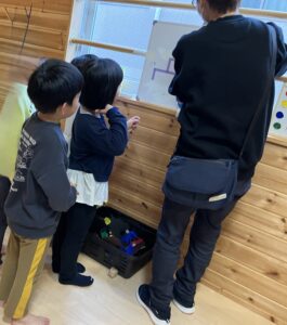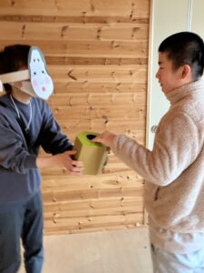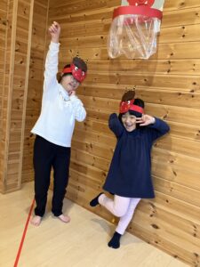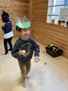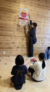 2月3日の節分では、こどもたちが鬼役になり、チーム対抗豆入れを行いました🚩