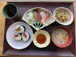 巻きずし・お刺身盛り合わせ・錦糸和え・具だくさん酒粕汁 です!!!