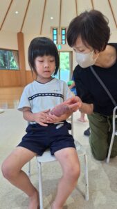 「かたい!」 「ボコボコしてる」 と両手で持ったり撫でたりして